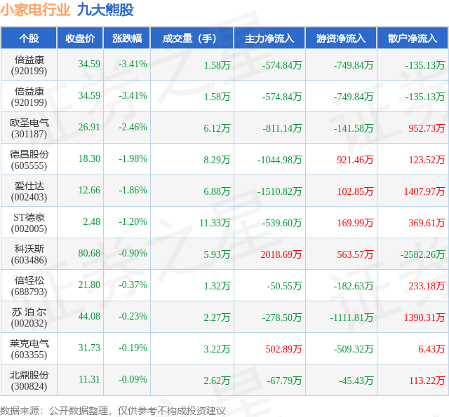 个股表现方面,小家电行业当日领跌股为倍益康(920199),该股当日报收34.59,下跌3.41%,成交量1.58万,主力资金净流出574.84万元。倍益康(920199)以下跌3.41%紧随其后,该股当日成交量1.58万,主力资金净流出574.84万元。除此之外,欧圣电气(301187)、德昌股份(605555)、爱仕达(002403)均进入当日熊股之列。具体个股列表见下表: