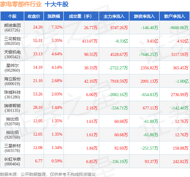 个股表现方面,家电零部件行业当日领涨股为朗迪集团(603726),该股当日报收24.2,上涨7.32%,成交量26.77万,主力资金净流入9747.26万元。三花智控(002050)以上涨5.35%紧随其后,该股当日成交量413.07万,主力资金净流出8.33亿元。除此之外,天银机电(300342)、星帅尔(002860)、海立股份(600619)均进入当日牛股之列。具体个股列表见下表: