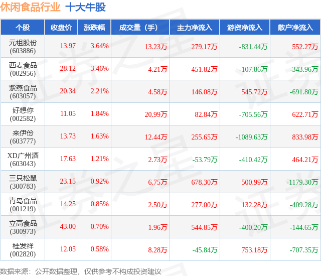 个股表现方面,休闲食品行业当日领涨股为元祖股份(603886),该股当日报收13.97,上涨3.64%,成交量13.23万,主力资金净流入279.17万元。西麦食品(002956)以上涨3.46%紧随其后,该股当日成交量4.21万,主力资金净流入451.82万元。除此之外,紫燕食品(603057)、好想你(002582)、来伊份(603777)均进入当日牛股之列。具体个股列表见下表: