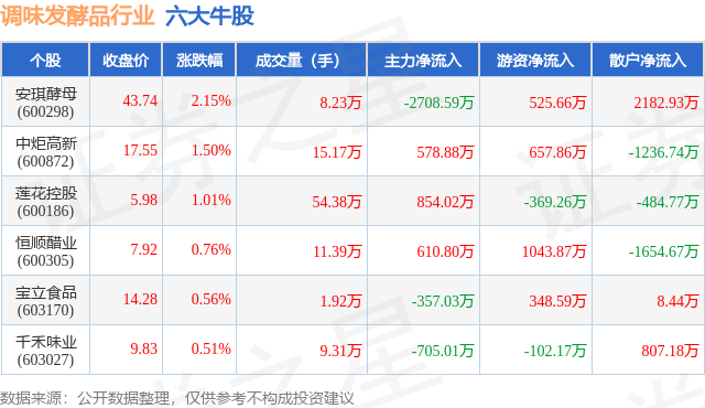 个股表现方面,调味发酵品行业当日领涨股为安琪酵母(600298),该股当日报收43.74,上涨2.15%,成交量8.23万,主力资金净流出2708.59万元。中炬高新(600872)以上涨1.5%紧随其后,该股当日成交量15.17万,主力资金净流入578.88万元。除此之外,莲花控股(600186)、恒顺醋业(600305)、宝立食品(603170)均进入当日牛股之列。具体个股列表见下表: