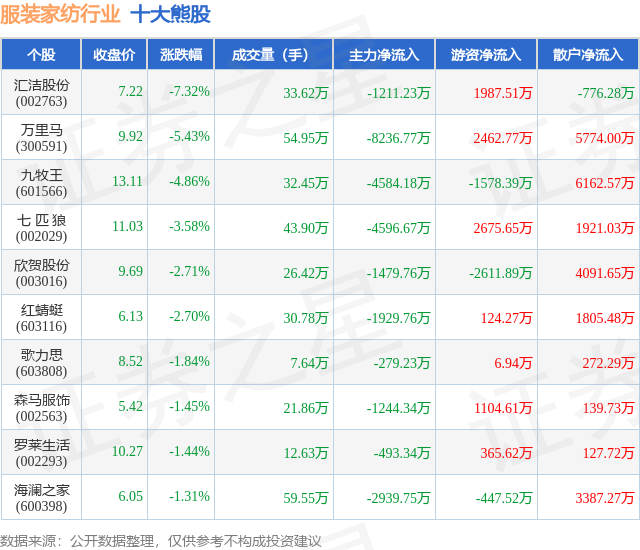 个股表现方面,服装家纺行业当日领跌股为汇洁股份(002763),该股当日报收7.22,下跌7.32%,成交量33.62万,主力资金净流出1211.23万元。万里马(300591)以下跌5.43%紧随其后,该股当日成交量54.95万,主力资金净流出8236.77万元。除此之外,九牧王(601566)、七 匹 狼(002029)、欣贺股份(003016)均进入当日熊股之列。具体个股列表见下表: