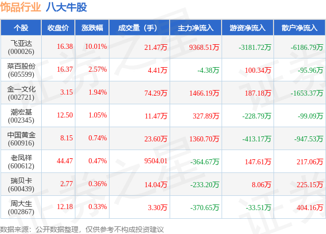 个股表现方面,饰品行业当日领涨股为飞亚达(000026),该股当日报收16.38,上涨10.01%,成交量21.47万,主力资金净流入9368.51万元。菜百股份(605599)以上涨2.57%紧随其后,该股当日成交量4.41万,主力资金净流出4.38万元。除此之外,金一文化(002721)、潮宏基(002345)、中国黄金(600916)均进入当日牛股之列。具体个股列表见下表: