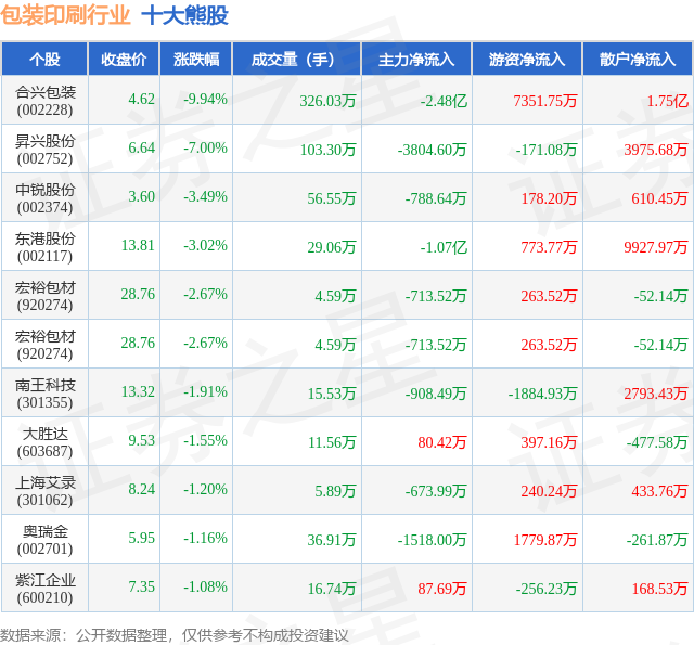 个股表现方面,包装印刷行业当日领跌股为合兴包装(002228),该股当日报收4.62,下跌9.94%,成交量326.03万,主力资金净流出2.48亿元。昇兴股份(002752)以下跌7.0%紧随其后,该股当日成交量103.3万,主力资金净流出3804.6万元。除此之外,中锐股份(002374)、东港股份(002117)、宏裕包材(920274)均进入当日熊股之列。具体个股列表见下表: