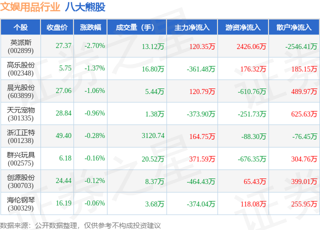 个股表现方面,文娱用品行业当日领跌股为英派斯(002899),该股当日报收27.37,下跌2.7%,成交量13.12万,主力资金净流入120.35万元。高乐股份(002348)以下跌1.37%紧随其后,该股当日成交量16.8万,主力资金净流出361.48万元。除此之外,晨光股份(603899)、天元宠物(301335)、浙江正特(001238)均进入当日熊股之列。具体个股列表见下表: