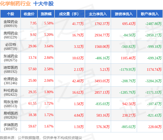 个股表现方面,化学制药行业当日领涨股为金陵药业(000919),该股当日报收7.95,上涨5.58%,成交量41.77万,主力资金净流入1792.37万元。奥翔药业(603229)以上涨5.2%紧随其后,该股当日成交量16.79万,主力资金净流入2934.77万元。除此之外,必贝特(688759)、东诚药业(002675)、迪哲医药(688192)均进入当日牛股之列。具体个股列表见下表:
