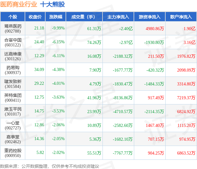 个股表现方面,医药商业行业当日领跌股为鹭燕医药(002788),该股当日报收21.18,下跌9.99%,成交量61.31万,主力资金净流出2.4亿元。合富中国(603122)以下跌6.15%紧随其后,该股当日成交量74.26万,主力资金净流出2.97亿元。除此之外,达嘉维康(301126)、药易购(300937)、建发致新(301584)均进入当日熊股之列。具体个股列表见下表: