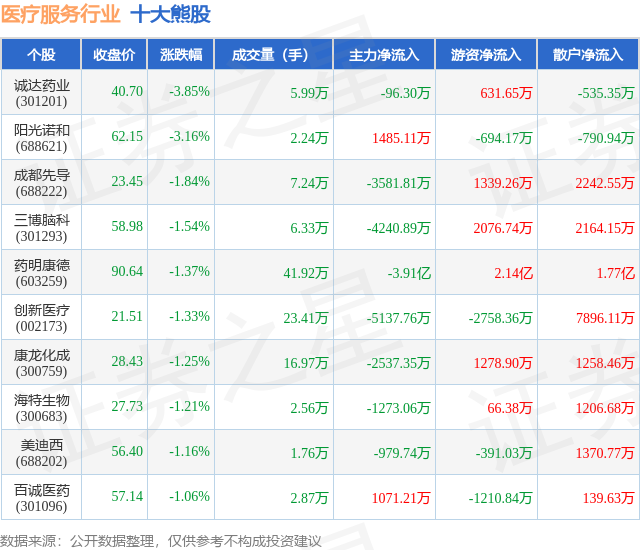 个股表现方面,医疗服务行业当日领跌股为诚达药业(301201),该股当日报收40.7,下跌3.85%,成交量5.99万,主力资金净流出96.3万元。阳光诺和(688621)以下跌3.16%紧随其后,该股当日成交量2.24万,主力资金净流入1485.11万元。除此之外,成都先导(688222)、三博脑科(301293)、药明康德(603259)均进入当日熊股之列。具体个股列表见下表: