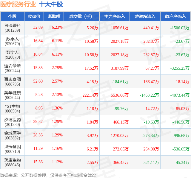 个股表现方面,医疗服务行业当日领涨股为普瑞眼科(301239),该股当日报收32.89,上涨6.23%,成交量5.26万,主力资金净流入1056.61万元。数字人(920670)以上涨6.11%紧随其后,该股当日成交量10.58万,主力资金净流入2027.18万元。除此之外,数字人(920670)、迪安诊断(300244)、百奥赛图(688796)均进入当日牛股之列。具体个股列表见下表: