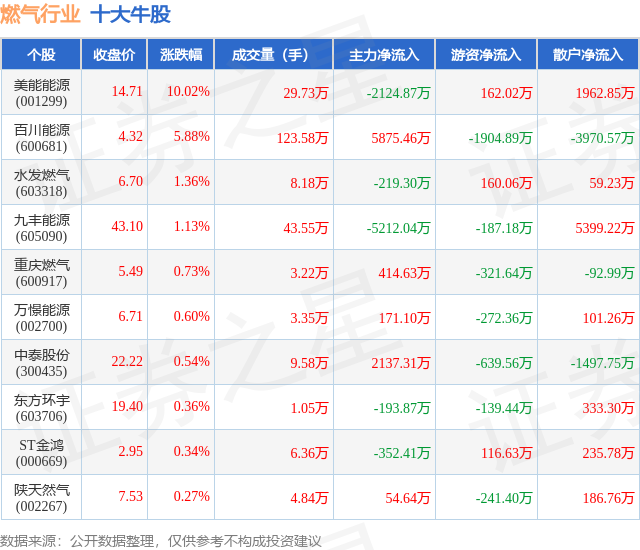 个股表现方面,燃气行业当日领涨股为美能能源(001299),该股当日报收14.71,上涨10.02%,成交量29.73万,主力资金净流出2124.87万元。百川能源(600681)以上涨5.88%紧随其后,该股当日成交量123.58万,主力资金净流入5875.46万元。除此之外,水发燃气(603318)、九丰能源(605090)、重庆燃气(600917)均进入当日牛股之列。具体个股列表见下表: