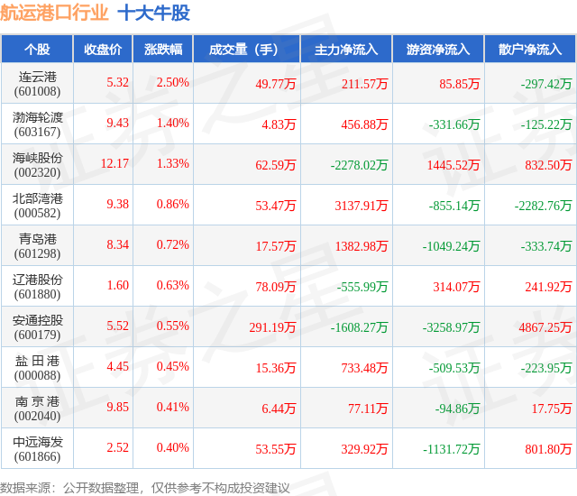 个股表现方面,航运港口行业当日领涨股为连云港(601008),该股当日报收5.32,上涨2.5%,成交量49.77万,主力资金净流入211.57万元。渤海轮渡(603167)以上涨1.4%紧随其后,该股当日成交量4.83万,主力资金净流入456.88万元。除此之外,海峡股份(002320)、北部湾港(000582)、青岛港(601298)均进入当日牛股之列。具体个股列表见下表: