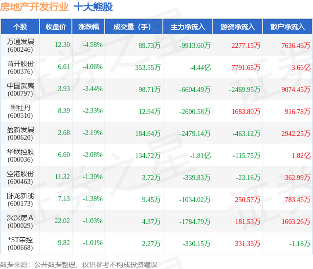 个股表现方面,房地产开发行业当日领跌股为万通发展(600246),该股当日报收12.3,下跌4.58%,成交量89.73万,主力资金净流出9913.6万元。首开股份(600376)以下跌4.06%紧随其后,该股当日成交量353.55万,主力资金净流出4.44亿元。除此之外,中国武夷(000797)、黑牡丹(600510)、盈新发展(000620)均进入当日熊股之列。具体个股列表见下表: