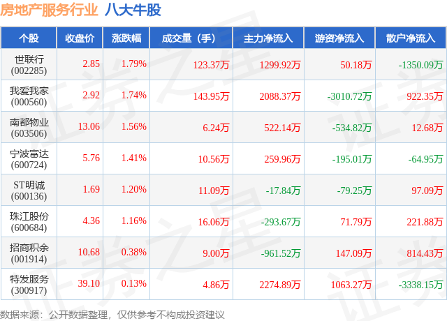 个股表现方面,房地产服务行业当日领涨股为世联行(002285),该股当日报收2.85,上涨1.79%,成交量123.37万,主力资金净流入1299.92万元。我爱我家(000560)以上涨1.74%紧随其后,该股当日成交量143.95万,主力资金净流入2088.37万元。除此之外,南都物业(603506)、宁波富达(600724)、ST明诚(600136)均进入当日牛股之列。具体个股列表见下表: