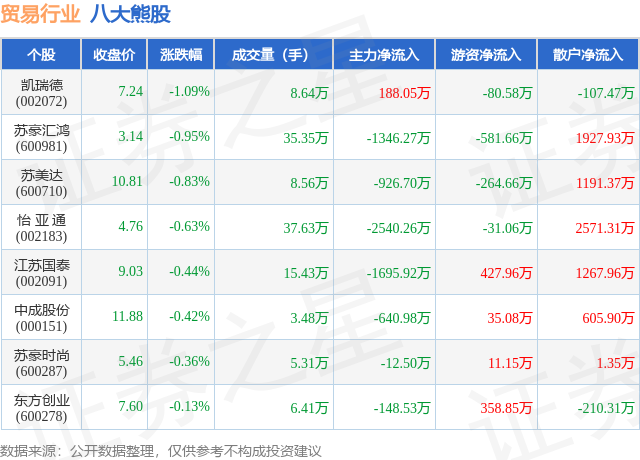 个股表现方面,贸易行业当日领跌股为凯瑞德(002072),该股当日报收7.24,下跌1.09%,成交量8.64万,主力资金净流入188.05万元。苏豪汇鸿(600981)以下跌0.95%紧随其后,该股当日成交量35.35万,主力资金净流出1346.27万元。除此之外,苏美达(600710)、怡 亚 通(002183)、江苏国泰(002091)均进入当日熊股之列。具体个股列表见下表: