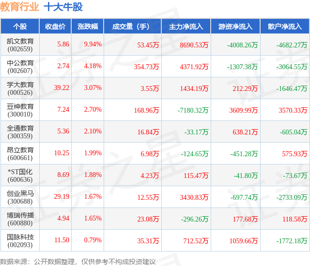个股表现方面,教育行业当日领涨股为凯文教育(002659),该股当日报收5.86,上涨9.94%,成交量53.45万,主力资金净流入8690.53万元。中公教育(002607)以上涨4.18%紧随其后,该股当日成交量354.73万,主力资金净流入4371.92万元。除此之外,学大教育(000526)、豆神教育(300010)、全通教育(300359)均进入当日牛股之列。具体个股列表见下表: