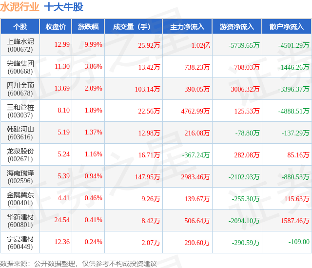 个股表现方面,水泥行业当日领涨股为上峰水泥(000672),该股当日报收12.99,上涨9.99%,成交量25.92万,主力资金净流入1.02亿元。尖峰集团(600668)以上涨3.86%紧随其后,该股当日成交量13.42万,主力资金净流入738.23万元。除此之外,四川金顶(600678)、三和管桩(003037)、韩建河山(603616)均进入当日牛股之列。具体个股列表见下表: