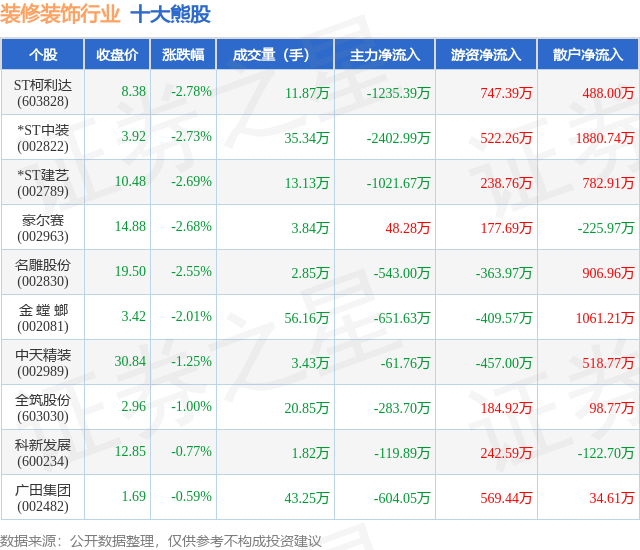个股表现方面,装修装饰行业当日领跌股为ST柯利达(603828),该股当日报收8.38,下跌2.78%,成交量11.87万,主力资金净流出1235.39万元。*ST中装(002822)以下跌2.73%紧随其后,该股当日成交量35.34万,主力资金净流出2402.99万元。除此之外,*ST建艺(002789)、豪尔赛(002963)、名雕股份(002830)均进入当日熊股之列。具体个股列表见下表: