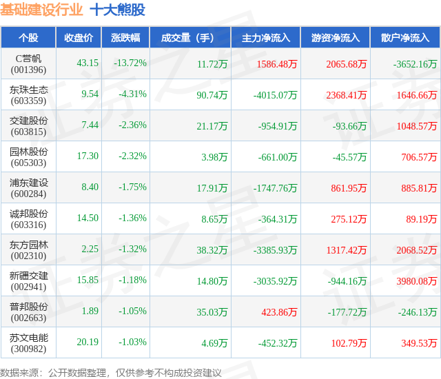 个股表现方面,基础建设行业当日领跌股为C誉帆(001396),该股当日报收43.15,下跌13.72%,成交量11.72万,主力资金净流入1586.48万元。东珠生态(603359)以下跌4.31%紧随其后,该股当日成交量90.74万,主力资金净流出4015.07万元。除此之外,交建股份(603815)、园林股份(605303)、浦东建设(600284)均进入当日熊股之列。具体个股列表见下表: