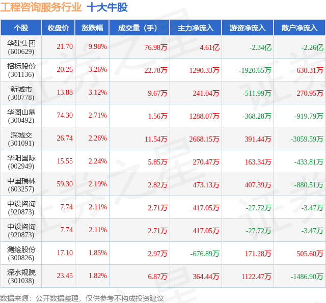 个股表现方面,工程咨询服务行业当日领涨股为华建集团(600629),该股当日报收21.7,上涨9.98%,成交量76.98万,主力资金净流入4.61亿元。招标股份(301136)以上涨3.26%紧随其后,该股当日成交量22.78万,主力资金净流入1290.33万元。除此之外,新城市(300778)、华图山鼎(300492)、深城交(301091)均进入当日牛股之列。具体个股列表见下表: