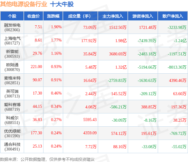 个股表现方面,其他电源设备行业当日领涨股为融发核电(002366),该股当日报收7.51,上涨1.9%,成交量73.09万,主力资金净流入1512.5万元。上海电气(601727)以上涨1.77%紧随其后,该股当日成交量177.92万,主力资金净流入1.98亿元。除此之外,新雷能(300593)、欧陆通(300870)、麦格米特(002851)均进入当日牛股之列。具体个股列表见下表: