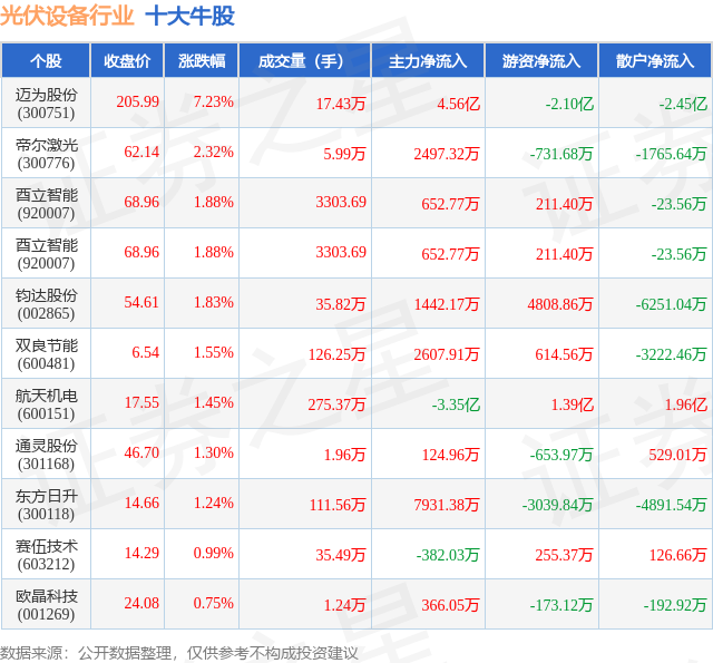 个股表现方面,光伏设备行业当日领涨股为迈为股份(300751),该股当日报收205.99,上涨7.23%,成交量17.43万,主力资金净流入4.56亿元。帝尔激光(300776)以上涨2.32%紧随其后,该股当日成交量5.99万,主力资金净流入2497.32万元。除此之外,酉立智能(920007)、酉立智能(920007)、钧达股份(002865)均进入当日牛股之列。具体个股列表见下表:
