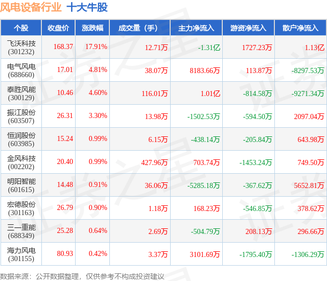 个股表现方面,风电设备行业当日领涨股为飞沃科技(301232),该股当日报收168.37,上涨17.91%,成交量12.71万,主力资金净流出1.31亿元。电气风电(688660)以上涨4.81%紧随其后,该股当日成交量38.07万,主力资金净流入8183.66万元。除此之外,泰胜风能(300129)、振江股份(603507)、恒润股份(603985)均进入当日牛股之列。具体个股列表见下表: