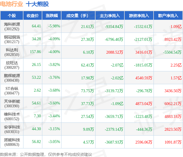 个股表现方面,电池行业当日领跌股为海科新源(301292),该股当日报收64.41,下跌5.98%,成交量21.61万,主力资金净流出9354.84万元。铜冠铜箔(301217)以下跌4.09%紧随其后,该股当日成交量27.3万,主力资金净流出6796.4万元。除此之外,科达利(002850)、欣旺达(300207)、鹏辉能源(300438)均进入当日熊股之列。具体个股列表见下表: