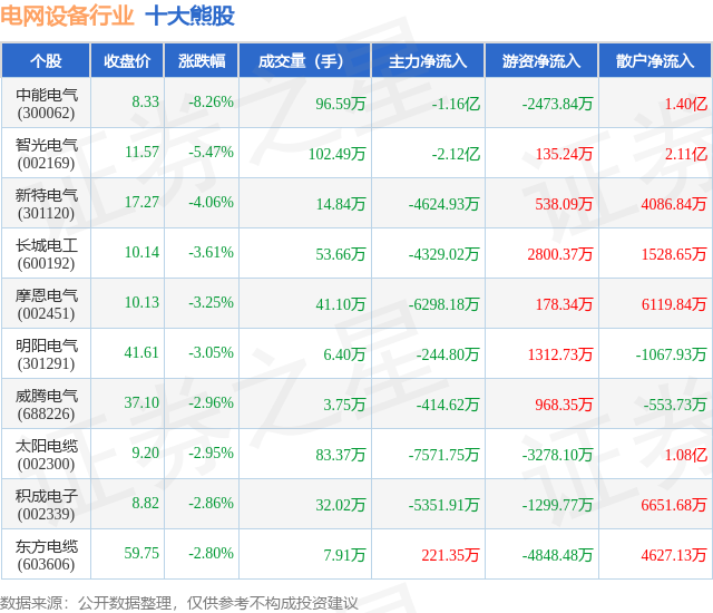 个股表现方面,电网设备行业当日领跌股为中能电气(300062),该股当日报收8.33,下跌8.26%,成交量96.59万,主力资金净流出1.16亿元。智光电气(002169)以下跌5.47%紧随其后,该股当日成交量102.49万,主力资金净流出2.12亿元。除此之外,新特电气(301120)、长城电工(600192)、摩恩电气(002451)均进入当日熊股之列。具体个股列表见下表: