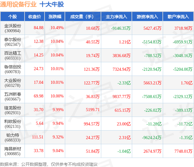 个股表现方面,通用设备行业当日领涨股为金沃股份(300984),该股当日报收84.88,上涨10.49%,成交量10.68万,主力资金净流出9146.35万元。泰尔股份(002347)以上涨10.04%紧随其后,该股当日成交量40.55万,主力资金净流入1.21亿元。除此之外,百达精工(603331)、鲁信创投(600783)、大业股份(603278)均进入当日牛股之列。具体个股列表见下表: