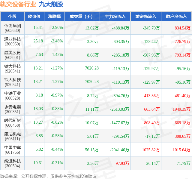 个股表现方面,轨交设备行业当日领跌股为今创集团(603680),该股当日报收15.41,下跌2.9%,成交量13.02万,主力资金净流出488.84万元。通业科技(300960)以下跌2.48%紧随其后,该股当日成交量3.3万,主力资金净流出603.35万元。除此之外,威奥股份(605001)、铁大科技(920541)、铁大科技(920541)均进入当日熊股之列。具体个股列表见下表: