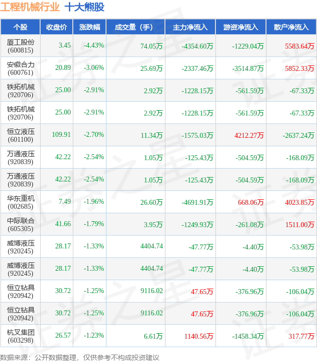 个股表现方面,工程机械行业当日领跌股为厦工股份(600815),该股当日报收3.45,下跌4.43%,成交量74.05万,主力资金净流出4354.6万元。安徽合力(600761)以下跌3.06%紧随其后,该股当日成交量25.69万,主力资金净流出2337.46万元。除此之外,铁拓机械(920706)、铁拓机械(920706)、恒立液压(601100)均进入当日熊股之列。具体个股列表见下表: