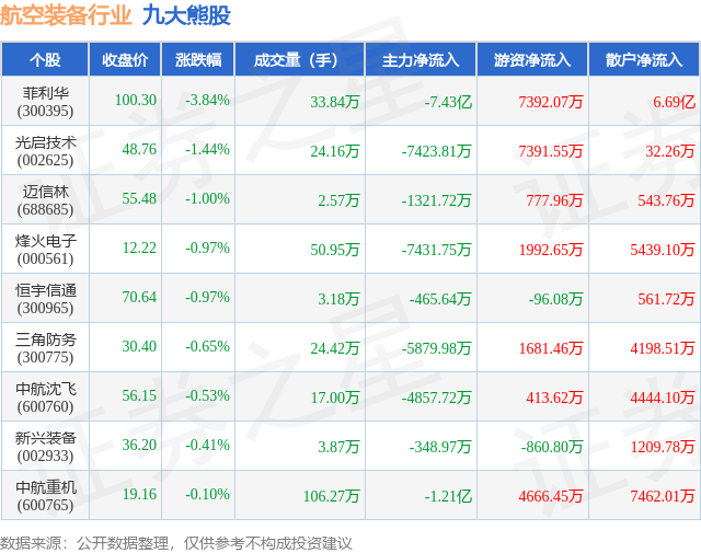 个股表现方面,航空装备行业当日领跌股为菲利华(300395),该股当日报收100.3,下跌3.84%,成交量33.84万,主力资金净流出7.43亿元。光启技术(002625)以下跌1.44%紧随其后,该股当日成交量24.16万,主力资金净流出7423.81万元。除此之外,迈信林(688685)、烽火电子(000561)、恒宇信通(300965)均进入当日熊股之列。具体个股列表见下表: