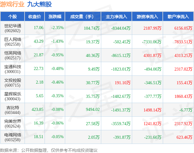 个股表现方面,游戏行业当日领跌股为世纪华通(002602),该股当日报收17.06,下跌2.35%,成交量104.74万,主力资金净流出8344.04万元。巨人网络(002558)以下跌1.43%紧随其后,该股当日成交量19.37万,主力资金净流出502.45万元。除此之外,恺英网络(002517)、宝通科技(300031)、文投控股(600715)均进入当日熊股之列。具体个股列表见下表: