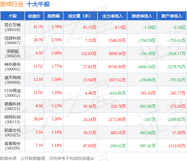 个股表现方面,游戏行业当日领涨股为昆仑万维(300418),该股当日报收41.7,上涨3.78%,成交量81.15万,主力资金净流入4.13亿元。迅游科技(300467)以上涨2.76%紧随其后,该股当日成交量7.33万,主力资金净流入1548.2万元。除此之外,汤姆猫(300459)、神州泰岳(300002)、盛天网络(300494)均进入当日牛股之列。具体个股列表见下表: