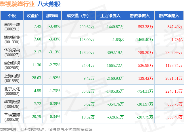 个股表现方面,影视院线行业当日领跌股为百纳千成(300291),该股当日报收7.49,下跌3.48%,成交量200.62万,主力资金净流出1440.87万元。博纳影业(001330)以下跌3.43%紧随其后,该股当日成交量123.0万,主力资金净流出1.63亿元。除此之外,华谊兄弟(300027)、金逸影视(002905)、上海电影(601595)均进入当日熊股之列。具体个股列表见下表: