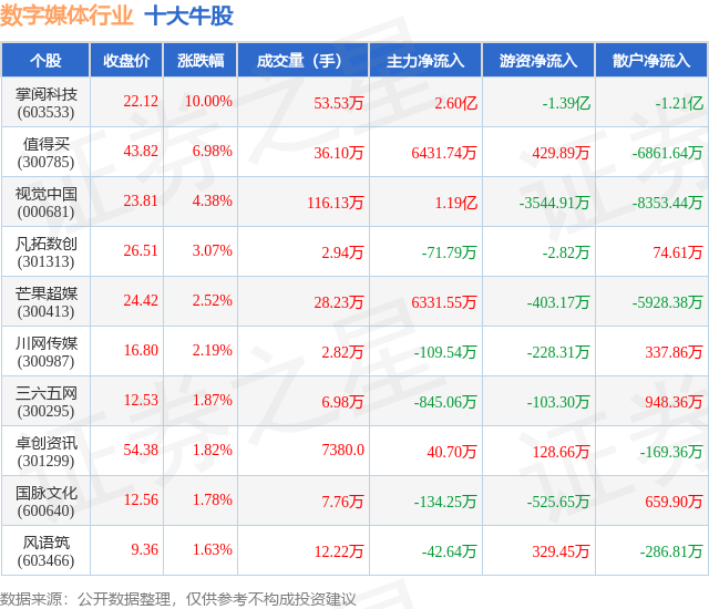 个股表现方面,数字媒体行业当日领涨股为掌阅科技(603533),该股当日报收22.12,上涨10.0%,成交量53.53万,主力资金净流入2.6亿元。值得买(300785)以上涨6.98%紧随其后,该股当日成交量36.1万,主力资金净流入6431.74万元。除此之外,视觉中国(000681)、凡拓数创(301313)、芒果超媒(300413)均进入当日牛股之列。具体个股列表见下表:
