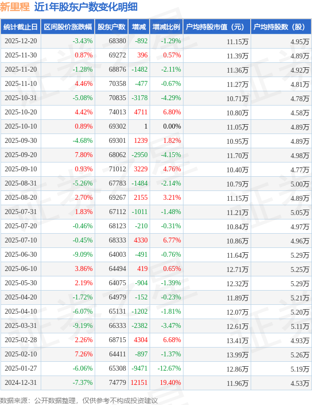 从股价来看,2025年11月30日至2025年12月20日,新里程区间跌幅为3.43%,在此期间股东户数减少892.0户,减幅为1.29%。