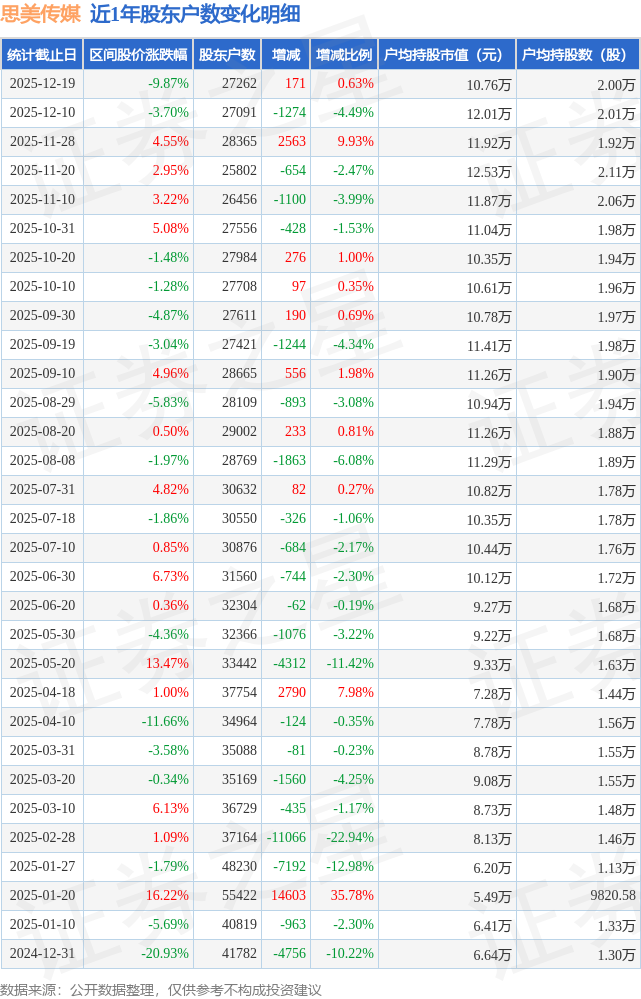 从股价来看,2025年12月10日至2025年12月19日,思美传媒区间跌幅为9.87%,在此期间股东户数增加171.0户,增幅为0.63%。