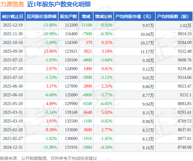 从股价来看,2025年10月10日至2025年12月19日,力源信息区间跌幅为13.8%,在此期间股东户数减少1.11万户,减幅为8.93%。
