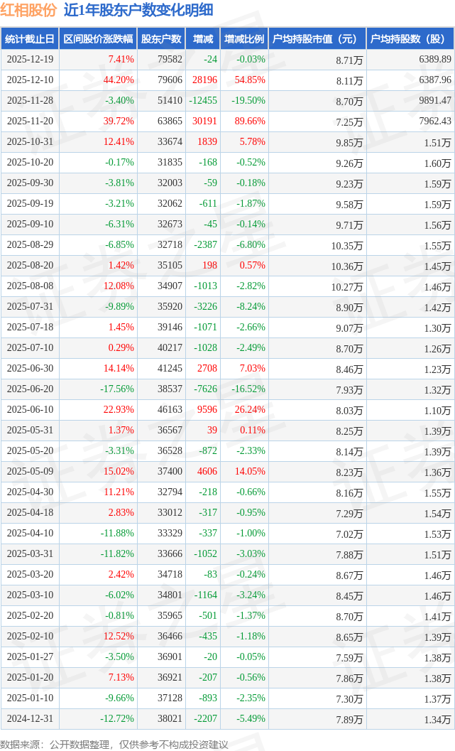 从股价来看,2025年12月10日至2025年12月19日,红相股份区间涨幅为7.41%,在此期间股东户数减少24.0户,减幅为0.03%。