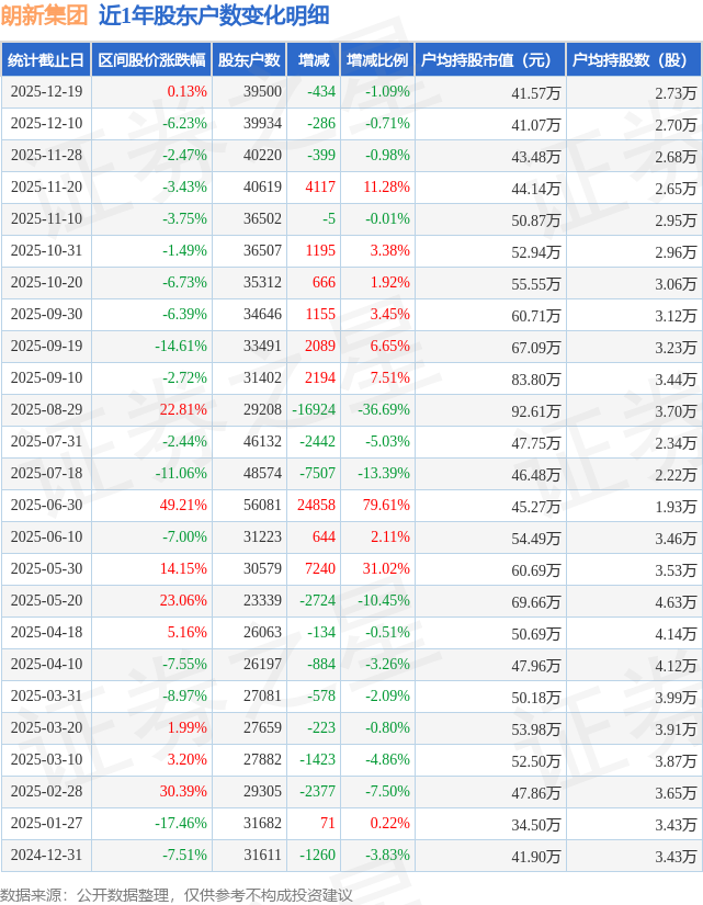 从股价来看,2025年12月10日至2025年12月19日,朗新集团区间涨幅为0.13%,在此期间股东户数减少434.0户,减幅为1.09%。