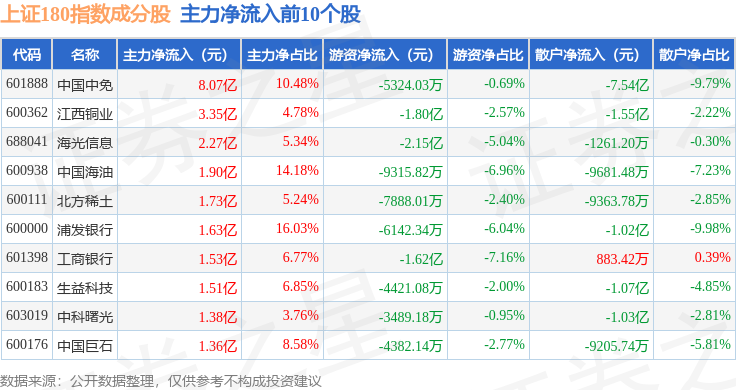 资金流向方面,上证180(000010)指数成份股当日主力资金净流出合计74.88亿元,游资资金净流入合计22.44亿元,散户资金净流入合计52.45亿元。成份股资金流向详情见下表: