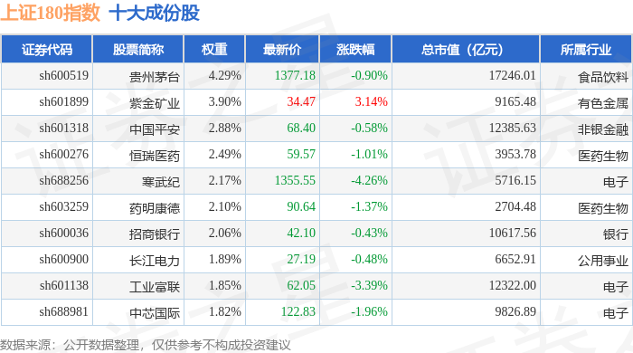 证券之星消息,12月31日,上证180(000010)指数报收于10015.86点,跌0.16%,成交2264.09亿元,换手率0.37%。当日该指数成份股中,上涨的有68家,中国卫通以10.01%的涨幅领涨,下跌的有97家,寒武纪以4.26%的跌幅领跌。