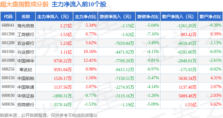 资金流向方面,超大盘(000043)指数成份股当日主力资金净流出合计20.95亿元,游资资金净流入合计4.66亿元,散户资金净流入合计16.28亿元。成份股资金流向详情见下表: