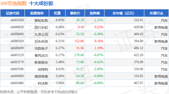 证券之星消息,12月31日,380可选(000107)指数报收于5602.2点,跌0.5%,成交130.98亿元,换手率1.32%。当日该指数成份股中,上涨的有9家,首旅酒店以4.17%的涨幅领涨,下跌的有22家,瑞可达以3.95%的跌幅领跌。