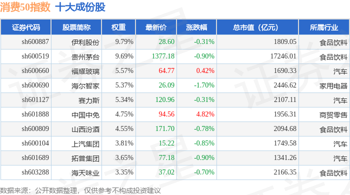 消费50(000126)指数十大成份股详情如下: