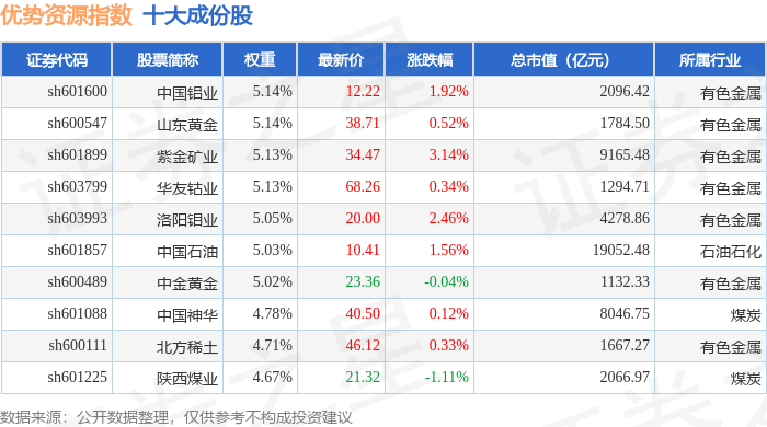 优势资源(000145)指数十大成份股详情如下: