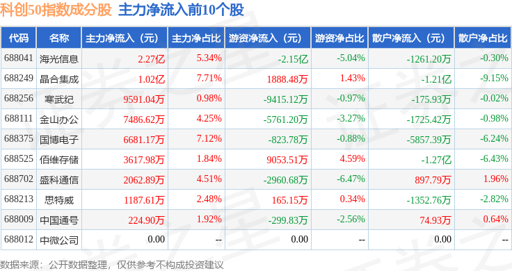 资金流向方面,科创50(000688)指数成份股当日主力资金净流出合计13.19亿元,游资资金净流入合计8.42亿元,散户资金净流入合计4.78亿元。成份股资金流向详情见下表: