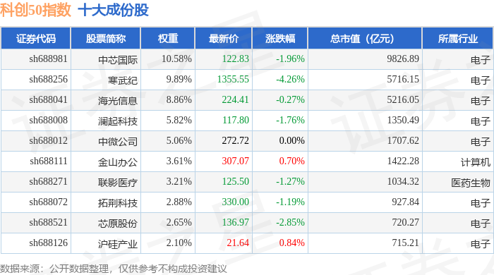 证券之星消息,12月31日,科创50(000688)指数报收于1344.2点,跌1.15%,成交492.85亿元,换手率1.09%。当日该指数成份股中,上涨的有17家,国博电子以12.05%的涨幅领涨,下跌的有32家,天岳先进以4.34%的跌幅领跌。