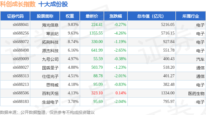 科创成长(000690)指数十大成份股详情如下: