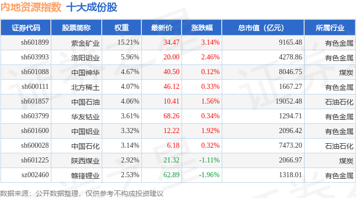 内地资源(000944)指数十大成份股详情如下: